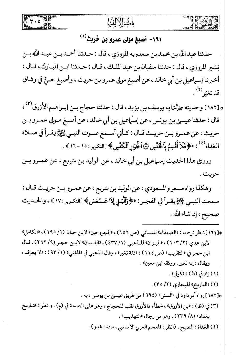 [182] (4) وحديثه حدثنا به يوسف بن يزيد، قال: حدثنا حجاج بن إبراهيم الأزرق (5)، قال: حدثنا عيسى بن يونس، عن إسماعيل بن أبي خالد، عن أصبغ مولى عمرو بن حريث، عن عمرو بن حريث قال: كأني أسمع صوت النبي صلى الله عليه وسلمع يقرأ في صلاة الغداة (6): «{فَلَا أُقْسِمُ بِالْخُنَّسِ 15 الْجَوَارِ الْكُنَّسِ} [التكوير: 15 - 16]».