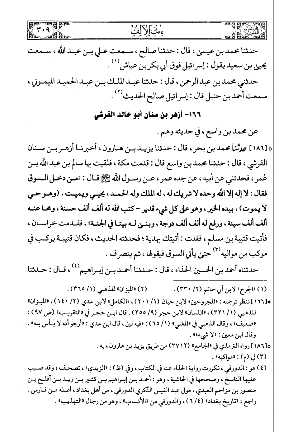 [186] (4) حدثنا محمد بن بحر، قال: حدثنا يزيد بن هارون، أخبرنا أزهر بن سنان القرشي، قال: حدثنا محمد بن واسع قال: قدمت مكة، فلقيت بها سالم بن عبد الله بن عُمر، فحدثني عن أبيه، عن جده عمر، عن رسول الله صلى الله عليه وسلمع قال: «من دخل السوق فقال: لا إله إلا الله وحده لا شريك له، له الملك وله الحمد، يحيي ويميت، (وهو حي لا يموت)، بيده الخير، وهو على كل شيء قدير - كتب الله له ألف ألف حسنة، ومحا عنه ألف ألف سيئة، ورفع له ألف ألف درجة، وبنى له بيتا في الجنة»، فقدمت خراسان، فأتيت قتيبة بن مسلم، فقلت: أتيتك بهدية؛ فحدثته الحديث، فكان قتيبة يركب في موكب من مواليه (5) حتى يأتي السوق فيقولها، ثم ينصرف.