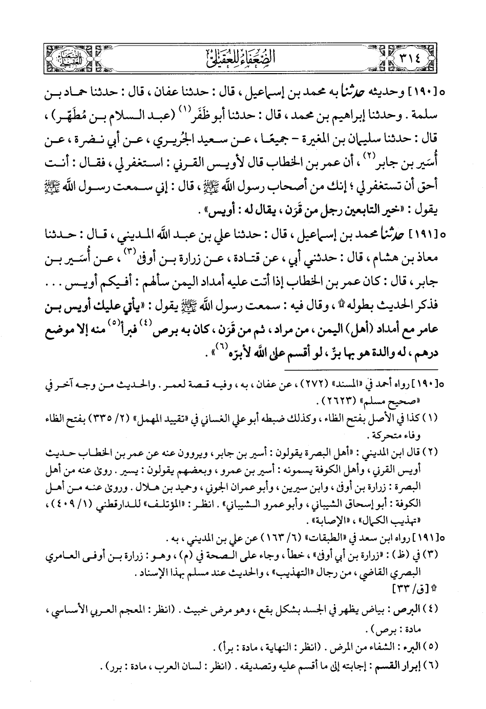 [191] (4) حدثنا محمد بن إسماعيل، قال: حدثنا علي بن عبد الله المديني، قال: حدثنا معاذ بن هشام، قال: حدثني أبي، عن قتادة، عن زرارة بن أوفى (5)، عن أُسَير بن جابر، قال: كان عمر بن الخطاب إذا أتت عليه أمداد اليمن سألهم: أفيكم أويس ... فذكر الحديث بطوله (6) ?، وقال فيه: سمعت رسول الله صلى الله عليه وسلمع يقول: «يأتي عليك أويس بن عامر مع أمداد (أهل) اليمن، من مراد، ثم من قَرَن، كان به برص (7) فبرأ (8) منه إلا موضع درهم، له والدة هو بها برٌّ، لو أقسم على الله لأبرّه (9)».