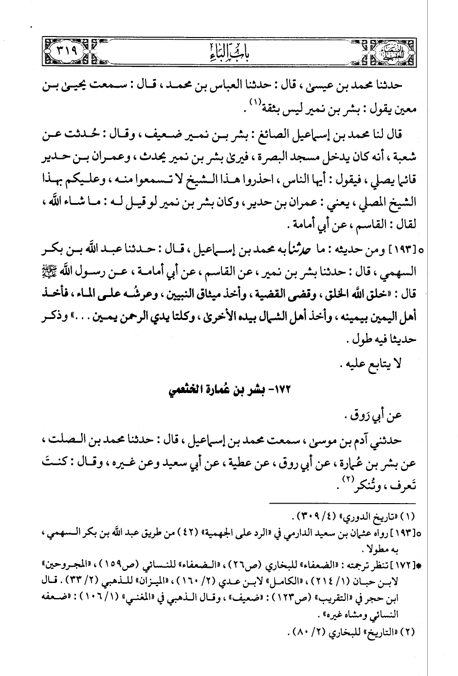 (3) * [172] تنظر ترجمته: «الضعفاء» للبخاري (ص26) , «الضعفاء» للنسائي (ص159) , «المجروحين» لابن حبان (1/ 214) , «الكامل» لابن عدي (2/ 160) , «الميزان» للذهبي (2/ 33). قال ابن حجر في «التقريب» (ص123): «ضعيف» , وقال الذهبي في «المغني» (1/ 106): «ضعفه النسائي ومشاه غيره».