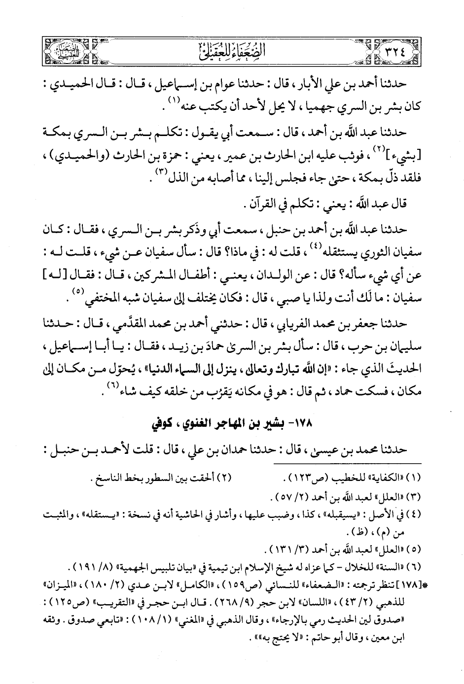 حدثنا عبد الله بن أحمد، قال: سمعت أبي يقول: تكلم بشر بن السري بمكة [بشيء] (2)، فوثب عليه ابن الحارث بن عمير، يعني: حمزة بن الحارث (والحميدي)، فلقد ذلّ بمكة، حتى جاء فجلس إلينا، مما أصابه من الذل (3).