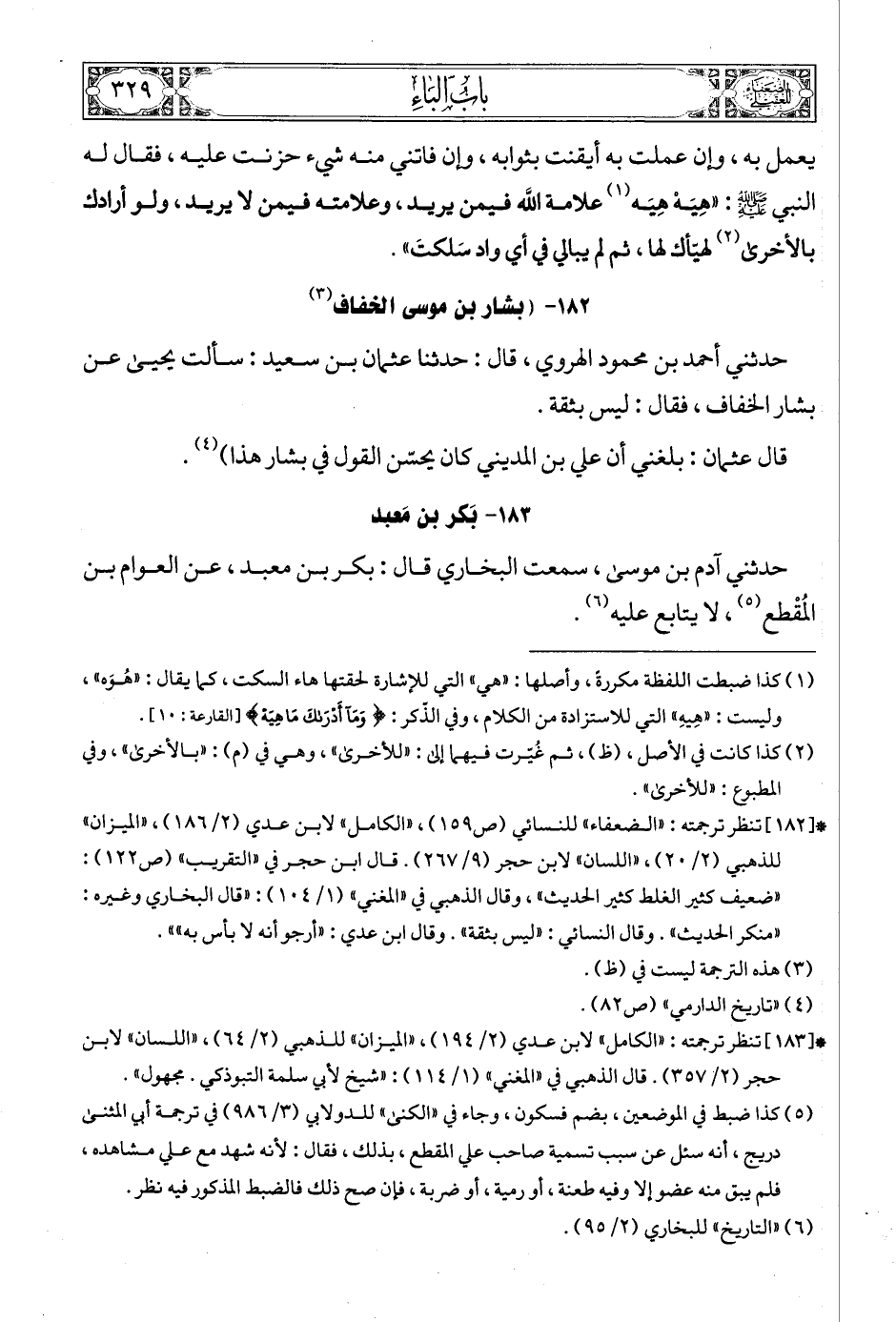 (6) * [183] تنظر ترجمته: «الكامل» لابن عدي (2/ 194) , «الميزان» للذهبي (2/ 64) , «اللسان» لابن حجر (2/ 357). قال الذهبي في «المغني» (1/ 114): «شيخ لأبي سلمة التبوذكي. مجهول».