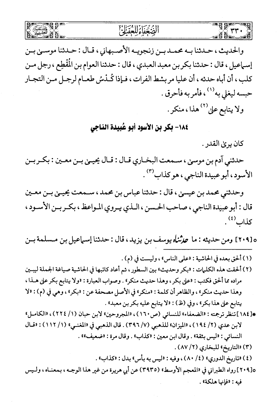 حدثني آدم بن موسى، سمعت البخاري قال: قال يحيى بن معين: بكر بن الأسود، أبو عبيدة الناجي، هو كذاب (4).