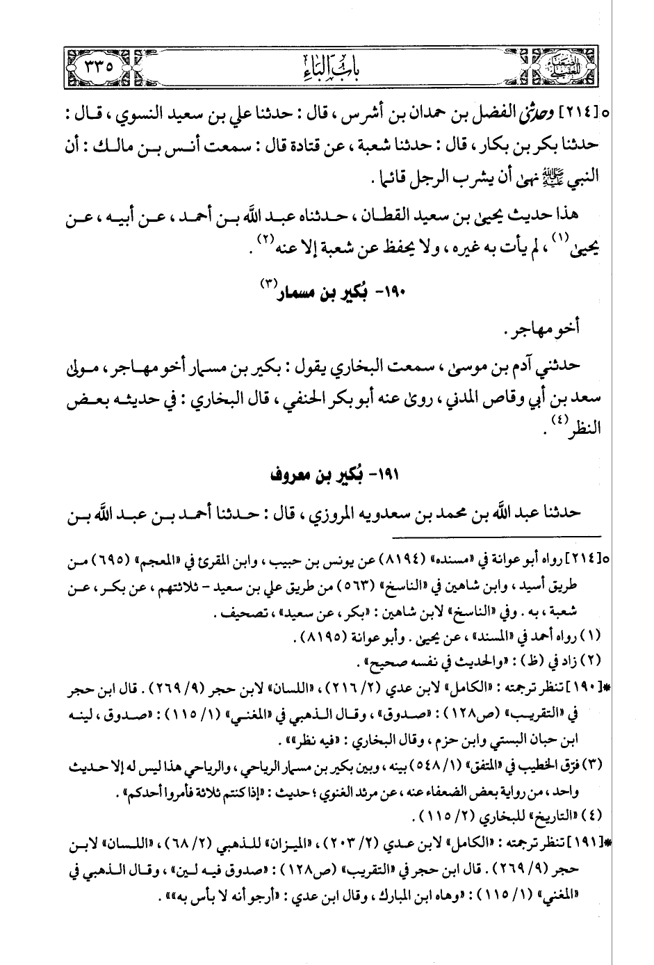 (4) * [190] تنظر ترجمته: «الكامل» لابن عدي (2/ 216) , «اللسان» لابن حجر (9/ 269). قال ابن حجر في «التقريب» (ص128): «صدوق» , وقال الذهبي في «المغني» (1/ 115): «صدوق، لينه ابن حبان البستي وابن حزم، وقال البخاري: «فيه نظر»».