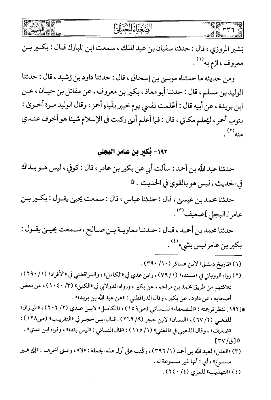 حدثنا عبد الله بن أحمد: سألت أبي عن بكير بن عامر، قال: كوفي، ليس هو بذاك في الحديث، ليس هو بالقوي في الحديث (4). ?