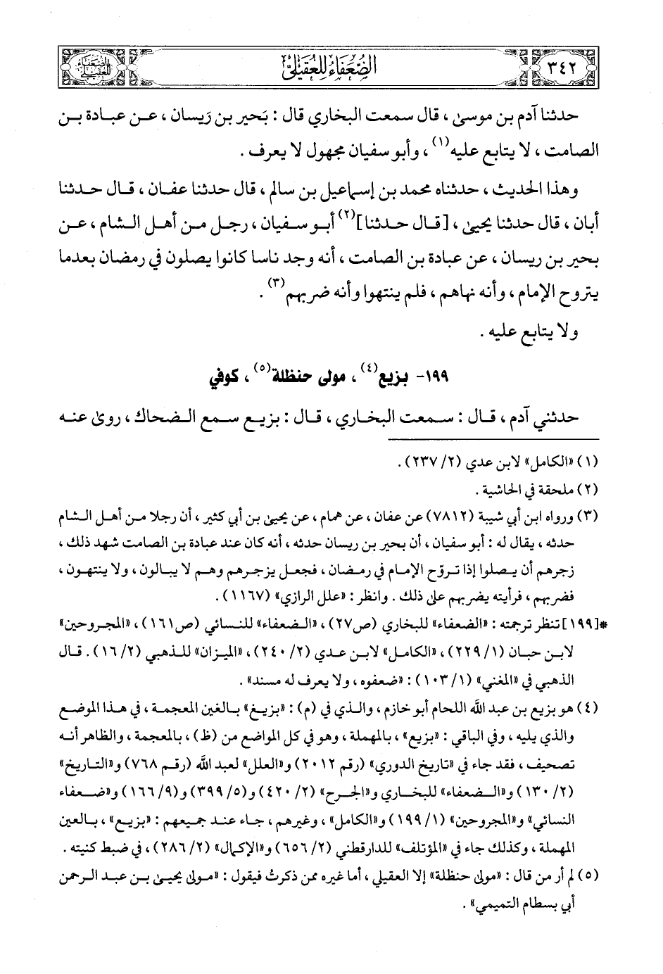 (4) * [199] تنظر ترجمته: «الضعفاء» للبخاري (ص27) , «الضعفاء» للنسائي (ص161) , «المجروحين» لابن حبان (1/ 229) , «الكامل» لابن عدي (2/ 240) , «الميزان» للذهبي (2/ 16). قال الذهبي في «المغني» (1/ 103): «ضعفوه، ولا يعرف له مسند».