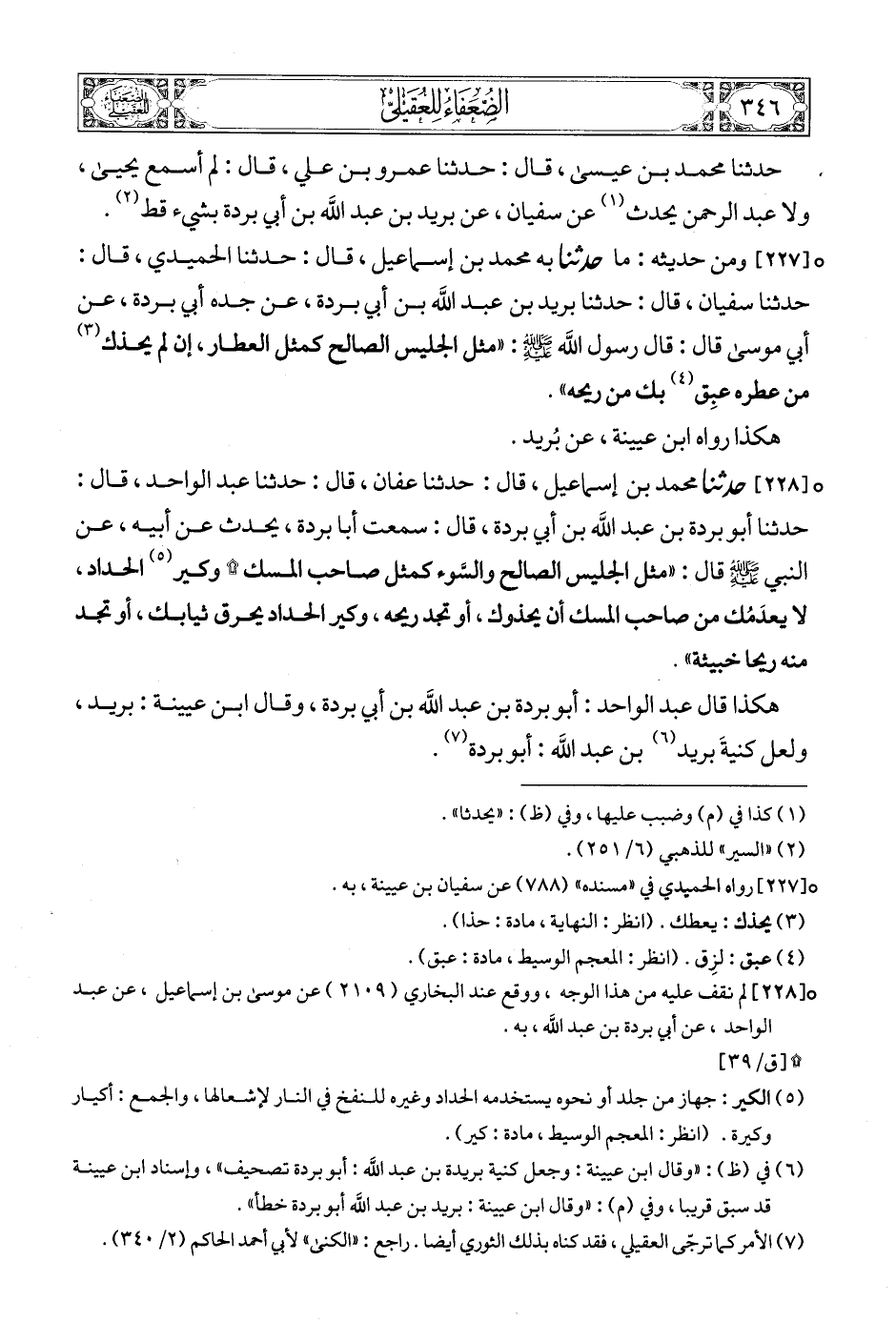 (9) في (ظ): «وقال ابن عيينة: وجعل كنية بريدة بن عبد الله: أبو بردة تصحيف»، وإسناد ابن عيينة قد سبق قريبا، وفي (م): «وقال ابن عيينة: بريد بن عبد الله أبو بردة خطأ».