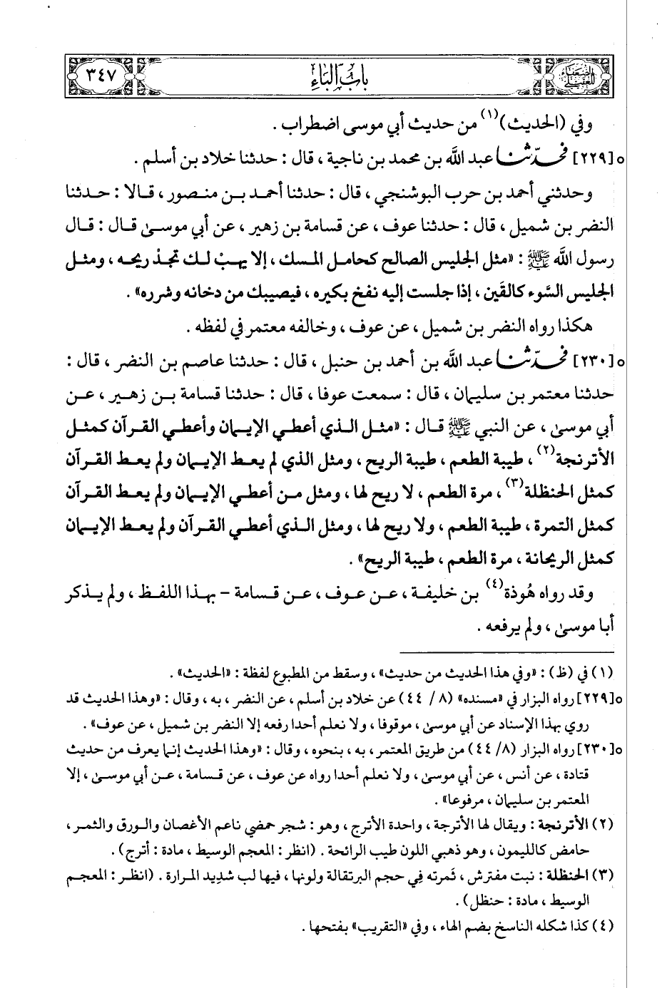 [230] (3) فحدثنا عبد الله بن أحمد بن حنبل، قال: حدثنا عاصم بن النضر، قال: حدثنا معتمر بن سليمان، قال: سمعت عوفا، قال: حدثنا قسامة بن زهير، عن أبي موسى، عن النبي صلى الله عليه وسلمع قال: «مثل الذي أعطي الإيمان وأعطي القرآن كمثل الأترنجة (4)، طيبة الطعم، طيبة الريح، ومثل الذي لم يعط الإيمان ولم يعط القرآن كمثل الحنظلة (5)، مرة الطعم، لا ريح لها، ومثل من أعطي الإيمان ولم يعط القرآن كمثل التمرة، طيبة الطعم، ولا ريح لها، ومثل الذي أعطي القرآن ولم يعط الإيمان كمثل الريحانة، مرة الطعم، طيبة الريح».