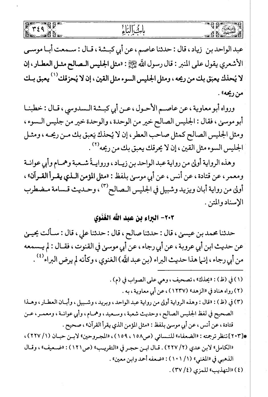 (4) * [203] تنظر ترجمته: «الضعفاء» للنسائي (ص158، 159) , «المجروحين» لابن حبان (1/ 227) , «الكامل» لابن عدي (2/ 227). قال ابن حجر في «التقريب» (ص121): «ضعيف» , وقال الذهبي في «المغني» (1/ 101): «ضعفه أحمد وابن معين».