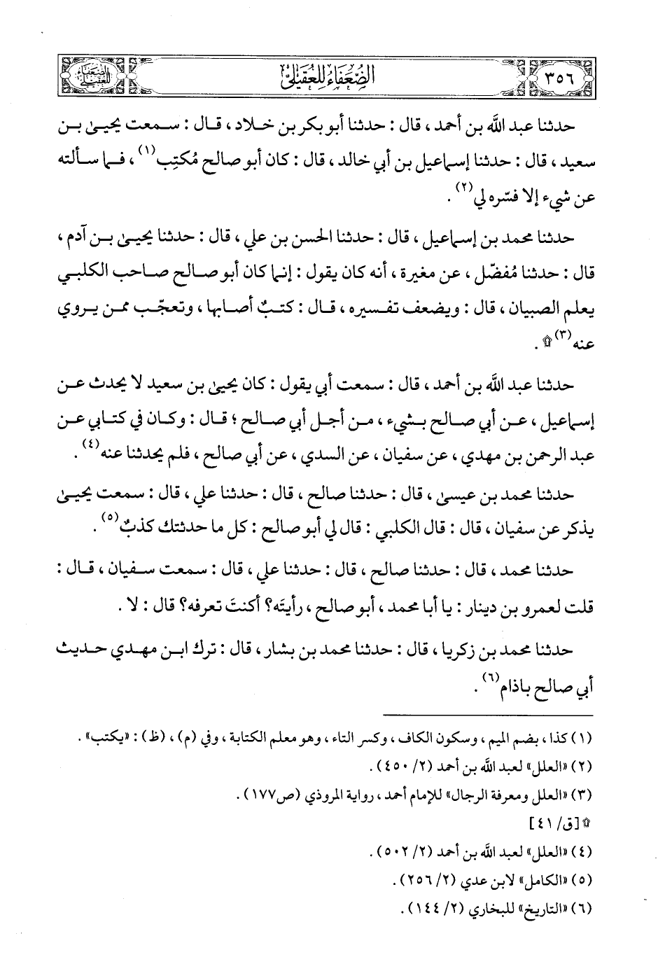 حدثنا محمد بن إسماعيل، قال: حدثنا الحسن بن علي، قال: حدثنا يحيى بن آدم، قال: حدثنا مُفضّل، عن مغيرة، أنه كان يقول: إنما كان أبو صالح صاحب الكلبي يعلم الصبيان، قال: ويضعف تفسيره، قال: كتبٌ أصابها، وتعجّب ممن يروي عنه (3) (4) ?.