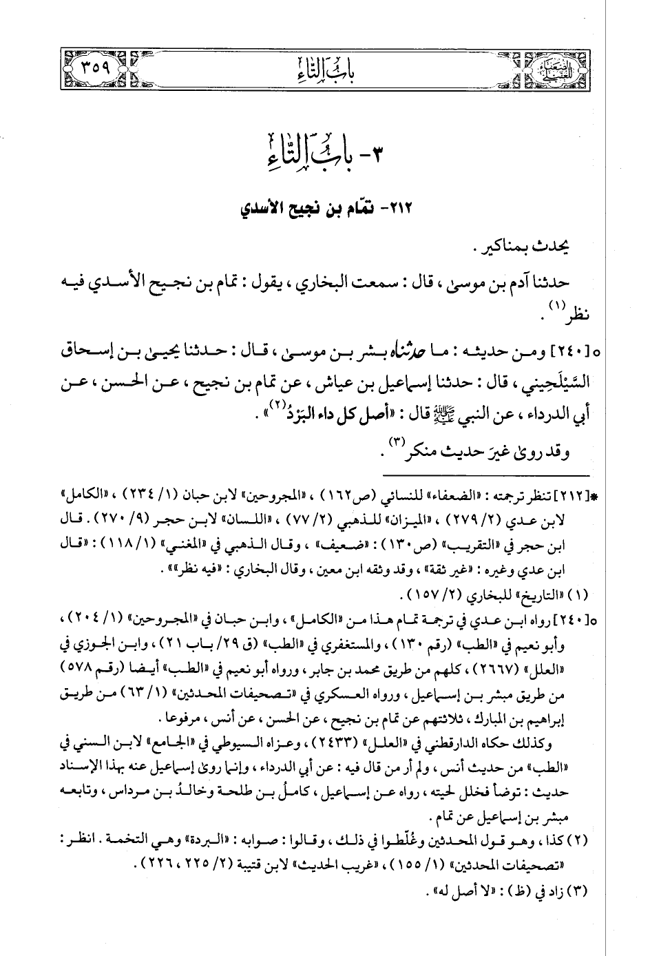 (3) [240] رواه ابن عدي في ترجمة تمام هذا من «الكامل»، وابن حبان في «المجروحين» (1/ 204)، وأبو نعيم في «الطب» (رقم 130)، والمستغفري في «الطب» (ق 29/باب 21)، وابن الجوزي في «العلل» (2667)، كلهم من طريق محمد بن جابر، ورواه أبو نعيم في «الطب» أيضا (رقم 578) من طريق مبشر بن إسماعيل، ورواه العسكري في «تصحيفات المحدثين» (1/ 63) من طريق إبراهيم بن المبارك، ثلاثتهم عن تمام بن نجيح، عن الحسن، عن أنس، مرفوعا.