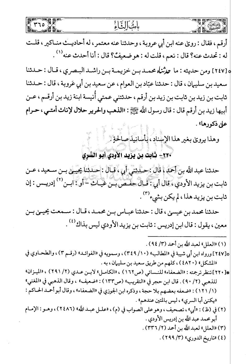 [247] (2) ومن حديثه: ما حدثناه محمد بن خزيمة بن راشد البصري، قال: حدثنا سعيد بن سليمان، قال: حدثنا عبّاد بن العوام، عن سعيد بن أبي عَروبة، قال: حدثنا ثابت بن زيد بن ثابت بن زيد بن أرقم، حدثتني عمتي أُنيسة ابنة زيد بن أرقم، عن أبيها زيد بن أرقم قال: قال رسول الله صلى الله عليه وسلمع: «الذهب والحرير حلال لإناث أمتي، حرام على ذكورها».