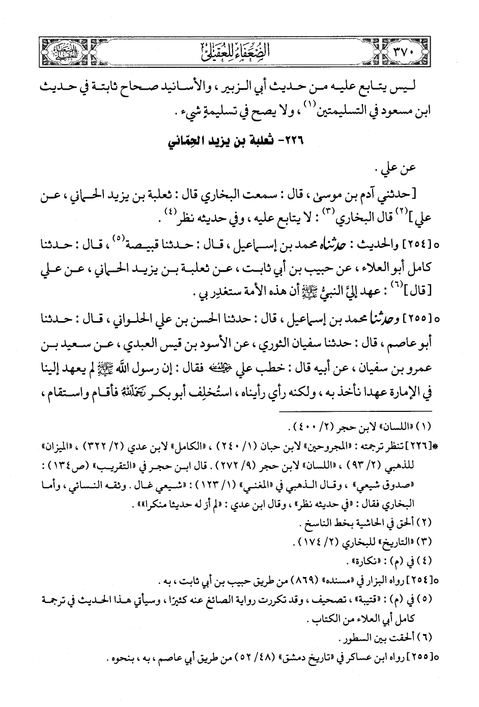 [حدثني آدم بن موسى، قال: سمعت البخاري قال: ثعلبة بن يزيد الحماني، عن علي] (3) قال البخاري (4): لا يتابع عليه، وفي حديثه نظر (5).