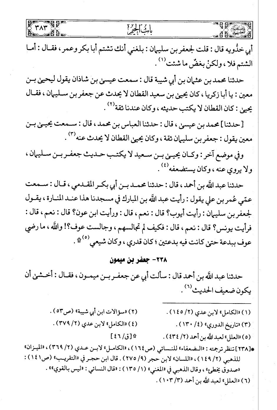 [حدثنا] محمد بن عيسى، قال: حدثنا العباس بن محمد، قال: سمعت يحيى بن معين يقول: جعفر بن سليمان ثقة، وكان يحيى القطان لا يحدث عنه (3).