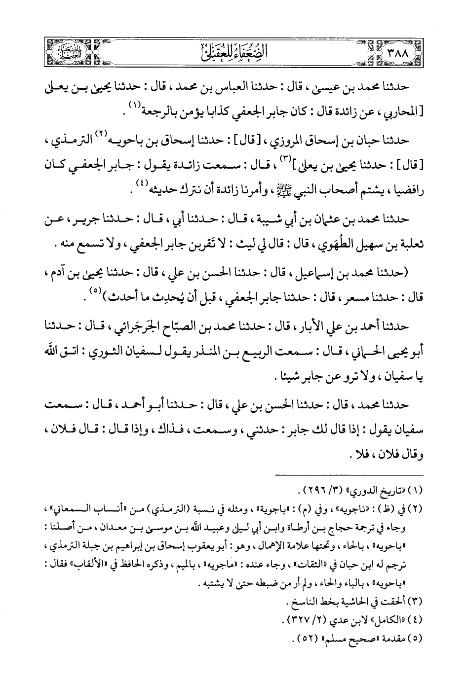 (حدثنا محمد بن إسماعيل، قال: حدثنا الحسن بن علي، قال: حدثنا يحيى بن آدم، قال: حدثنا مسعر، قال: حدثنا جابر الجعفي، قبل أن يُحدِث ما أحدث) (5).