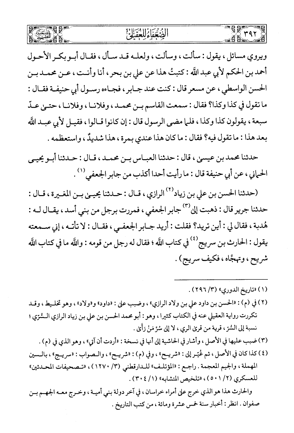 (حدثنا الحسن بن علي بن زياد (2) الرازي، قال: حدثنا يحيى بن المغيرة، قال: حدثنا جرير قال: ذهبت إلى (3) جابر الجعفي، فمررت برجل من بني أسد، يقال له: هُدبة، فقال لي: أين تريد؟ فقلت: أريد جابر الجعفي، فقال: لا تأته، إني سمعته يقول: الحارث بن سريج (4) في كتاب الله؛ فقال له رجل من قومه: والله ما في كتاب الله شريح، وتهجَّاه، فكيف سريج).