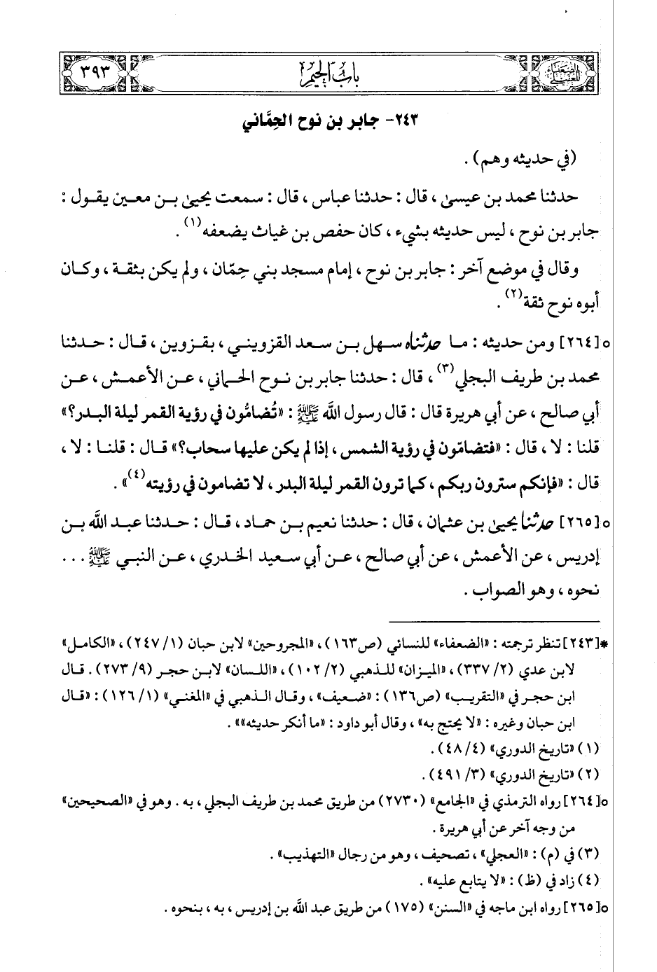 (1) * [243] تنظر ترجمته: «الضعفاء» للنسائي (ص163) , «المجروحين» لابن حبان (1/ 247) , «الكامل» لابن عدي (2/ 337) , «الميزان» للذهبي (2/ 102) , «اللسان» لابن حجر (9/ 273). قال ابن حجر في «التقريب» (ص136): «ضعيف» , وقال الذهبي في «المغني» (1/ 126): «قال ابن حبان وغيره: «لا يحتج به»، وقال أبو داود: «ما أنكر حديثه»».