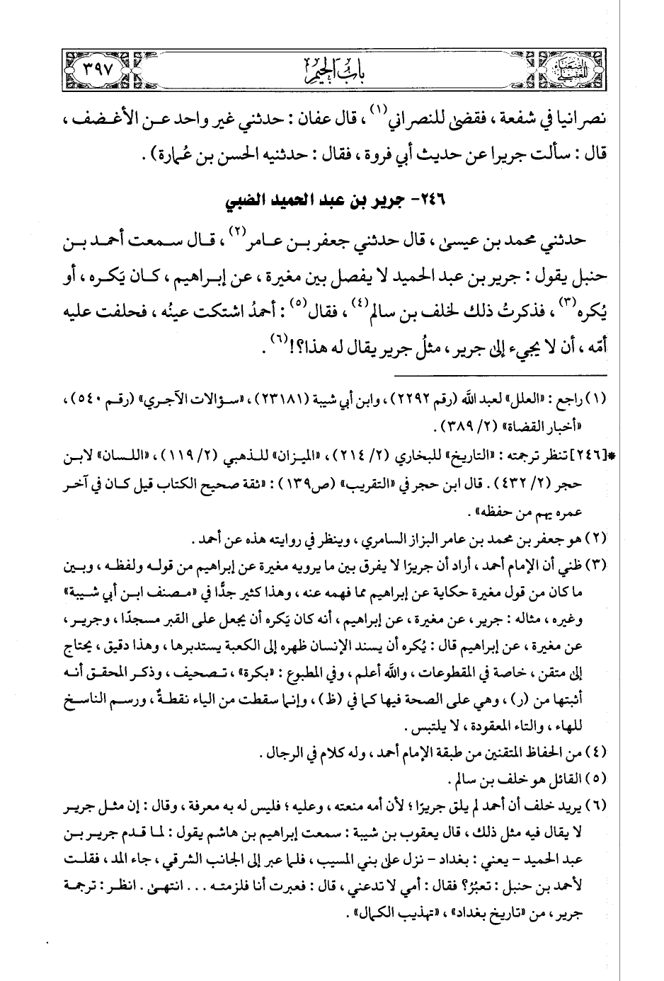 (7) يريد خلف أن أحمد لم يلق جريرًا؛ لأن أمه منعته، وعليه؛ فليس له به معرفة، وقال: إن مثل جرير لا يقال فيه مثل ذلك، قال يعقوب بن شيبة: سمعت إبراهيم بن هاشم يقول: لما قدم جرير بن عبد الحميد - يعني: بغداد - نزل على بني المسيب، فلما عبر إلى الجانب الشرقي، جاء المد، فقلت لأحمد بن حنبل: تعبُرُ؟ فقال: أمي لا تدعني، قال: فعبرت أنا فلزمته ... انتهى. انظر: ترجمة جرير، من «تاريخ بغداد»، «تهذيب الكمال».