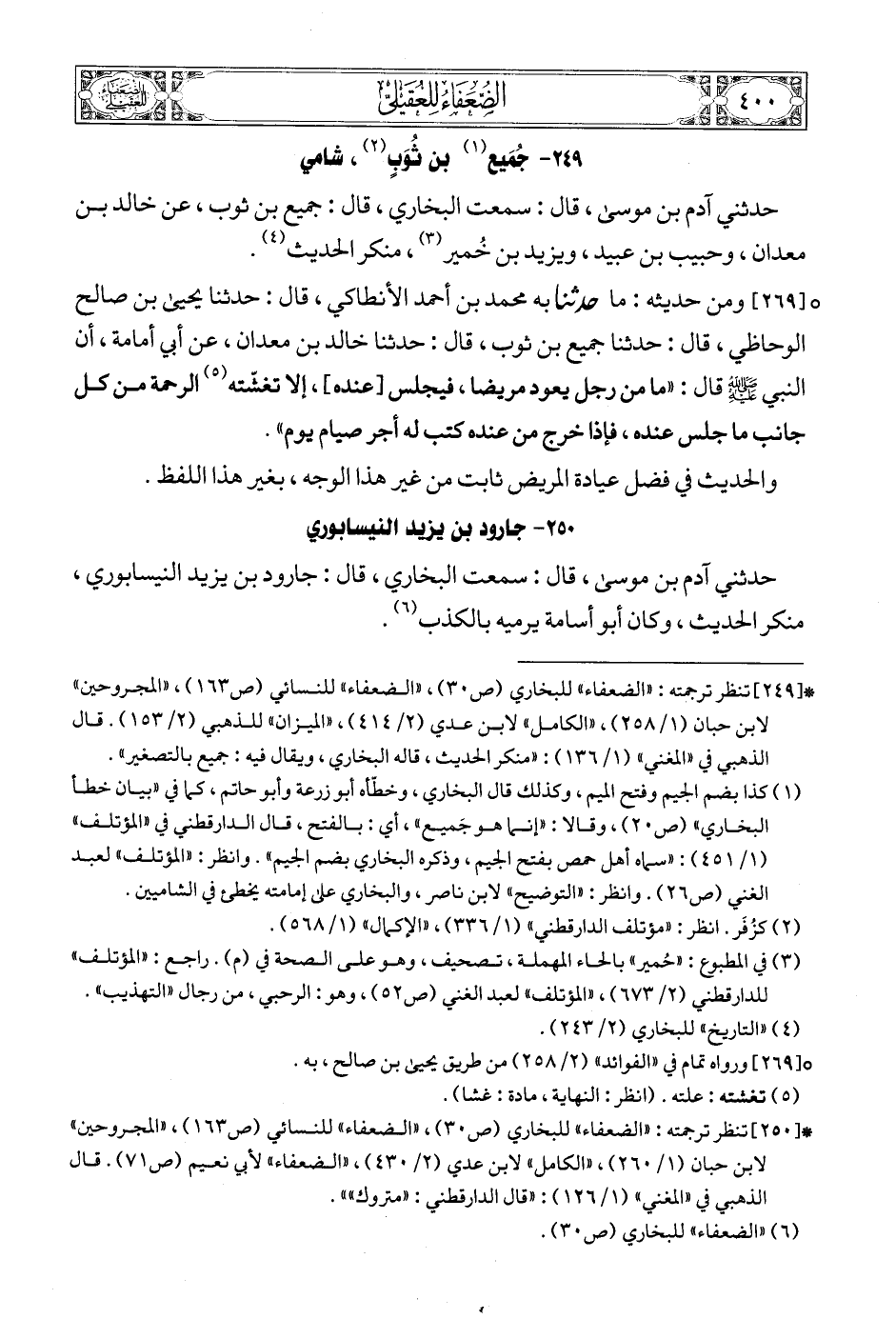 (1) * [249] تنظر ترجمته: «الضعفاء» للبخاري (ص30) , «الضعفاء» للنسائي (ص163) , «المجروحين» لابن حبان (1/ 258) , «الكامل» لابن عدي (2/ 414) , «الميزان» للذهبي (2/ 153). قال الذهبي في «المغني» (1/ 136): «منكر الحديث، قاله البخاري، ويقال فيه: جميع بالتصغير».