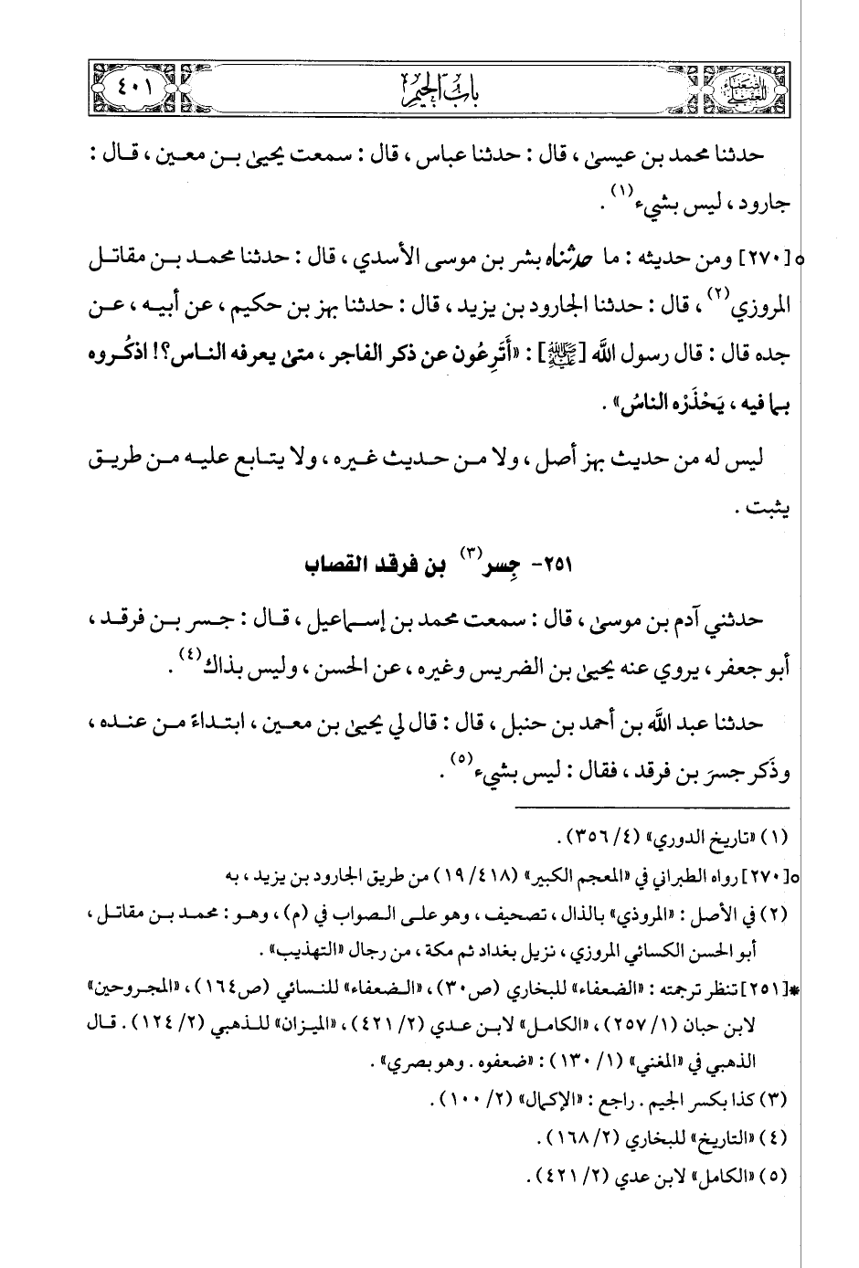 (4) * [251] تنظر ترجمته: «الضعفاء» للبخاري (ص30) , «الضعفاء» للنسائي (ص164) , «المجروحين» لابن حبان (1/ 257) , «الكامل» لابن عدي (2/ 421) , «الميزان» للذهبي (2/ 124). قال الذهبي في «المغني» (1/ 130): «ضعفوه. وهو بصري».