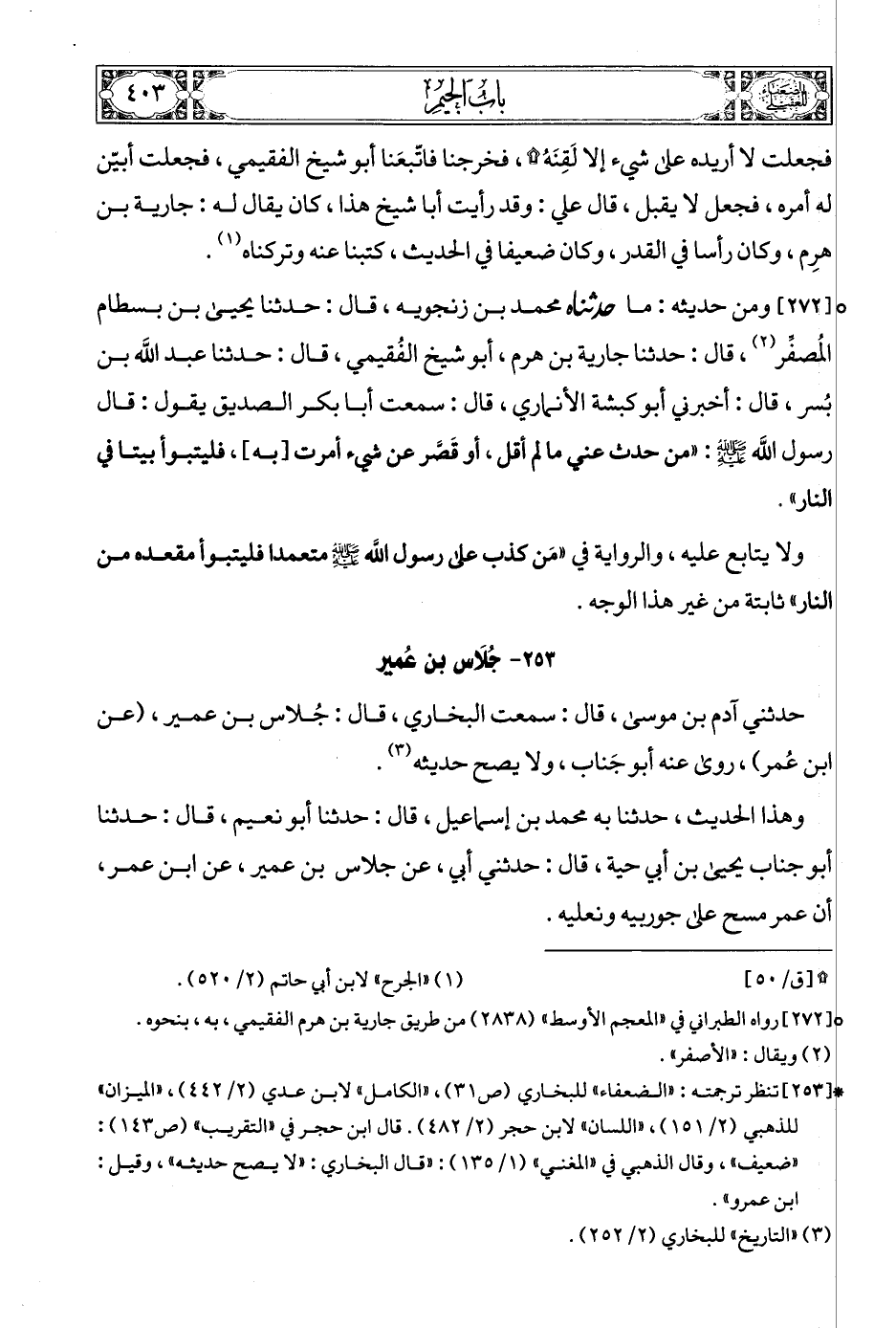 وهذا الحديث، حدثنا به محمد بن إسماعيل، قال: حدثنا أبو نعيم، قال: حدثنا أبو جناب يحيى بن أبي حية، قال: حدثني أبي، عن جلاس بن عمير، عن ابن عمر، أن عمر مسح على جوربيه ونعليه.