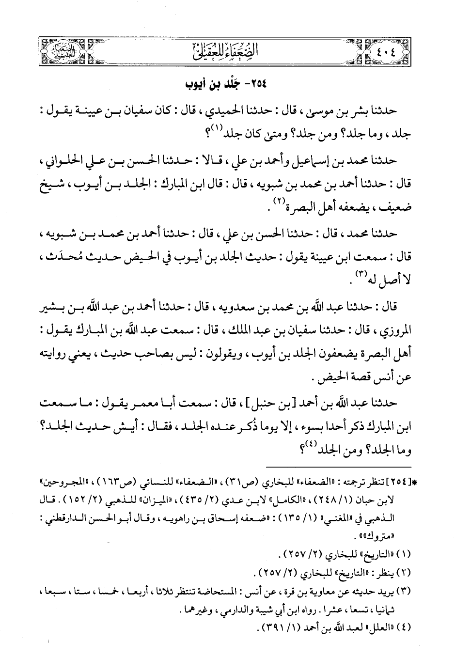 حدثنا محمد بن إسماعيل وأحمد بن علي، قالا: حدثنا الحسن بن علي الحلواني، قال: حدثنا أحمد بن محمد بن شبويه، قال: قال ابن المبارك: الجلد بن أيوب، شيخ ضعيف، يضعفه أهل البصرة (3).