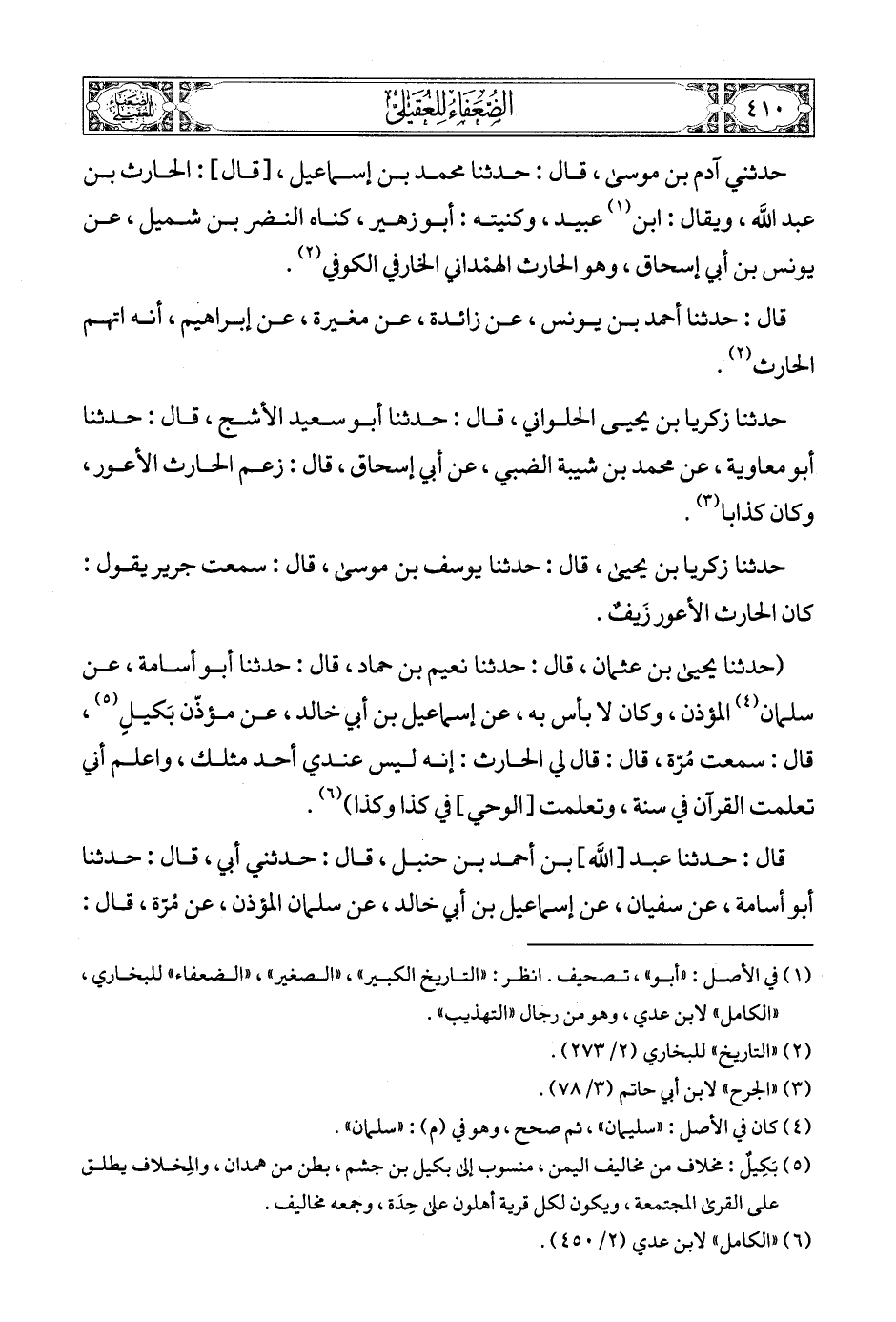 (حدثنا يحيى بن عثمان، قال: حدثنا نعيم بن حماد، قال: حدثنا أبو أسامة، عن سلمان (4) المؤذن، وكان لا بأس به، عن إسماعيل بن أبي خالد، عن مؤذّن بَكيلٍ (5)، قال: سمعت مُرّة، قال: قال لي الحارث: إنه ليس عندي أحد مثلك، واعلم أني تعلمت القرآن في سنة، وتعلمت [الوحي] في كذا وكذا) (6).
