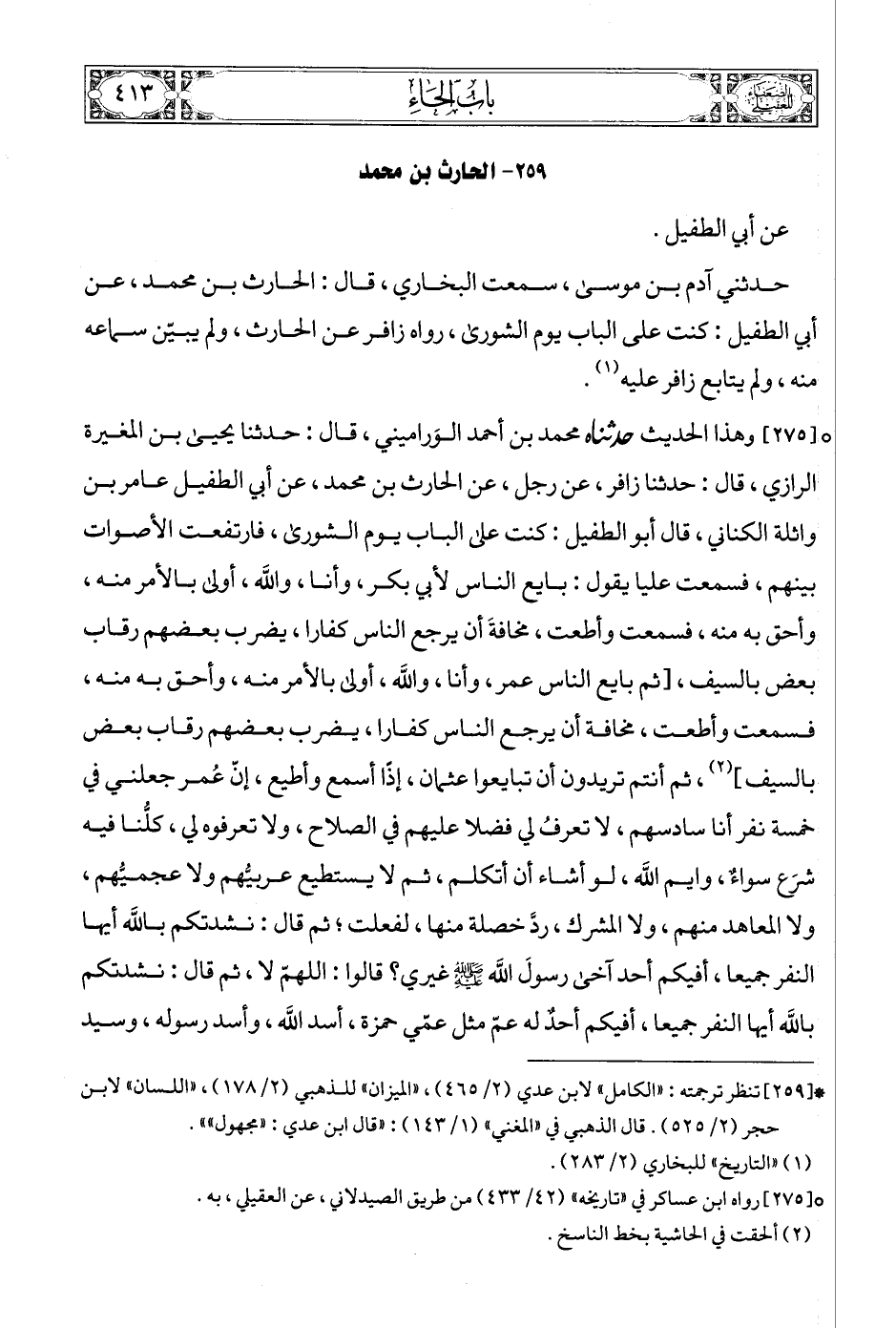 حدثني آدم بن موسى، سمعت البخاري، قال: الحارث بن محمد، عن أبي الطفيل: كنت على الباب يوم الشورى، رواه زافر عن الحارث، ولم يبيّن سماعه منه، ولم يتابع زافر عليه (2).