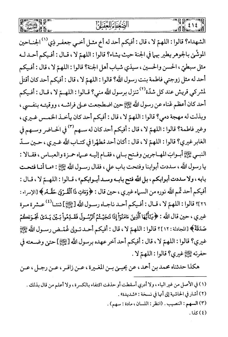 الشهداء؟ قالوا: اللهمّ لا، قال: أفيكم أحد له أخ مثل أخي جعفر ذِي (1) الجناحين الموشَّى بالجوهر يطير بهما في الجنة حيث يشاء؟ قالوا: اللهمّ لا، قال: أفيكم أحد له مثل سبطيّ، الحسن والحسين، سيدَي شباب أهل الجنة؟ قالوا: اللهمّ لا، قال: أفيكم أحد له مثل زوجتي فاطمة بنت رسول الله؟ قالوا: اللهمّ لا، قال: أفيكم أحد كان أقتلَ لمشركي قريش عند كل شدّة (2) تنزل برسول الله مني؟ قالوا: اللهمّ لا، قال: أفيكم أحد كان أعظم غَناء عن رسول الله صلى الله عليه وسلمع حين اضطجعت على فراشه، ووقيته بنفسي، وبذلت له مهجة دمي؟ قالوا: اللهمّ لا، قال: أفيكم أحد كان يأخذ الخمس غيري، وغير فاطمة؟ قالوا: اللهمّ لا، قال: أفيكم أحد كان له سهم (3) في الحاضر وسهم في الغابر غيري؟ قالوا: اللهمّ لا، قال: أكان أحد مُطهَّرا في كتاب الله غيري، حين سدّ النبي صلى الله عليه وسلمع أبوابَ المهاجرين وفتح بابي، فقام إليه عماه حمزة والعباس، فقالا: يا رسول الله، سددت أبوابنا وفتحت باب علي، فقال رسول الله صلى الله عليه وسلمع: «ما أنا فتحت بابه، ولا سددت أبوابكم، بل الله فتح بابه وسد أبوابكم»، قالوا: اللهمّ لا، قال: أفيكم أحد تمّم الله نوره من السماء غيري، حين قال: {وَآتِ ذَا الْقُرْبَى حَقَّهُ} [الإسراء: 26]؟ قالوا: اللهمّ لا، قال: أفيكم أحد ناجاه رسول الله [صلى الله عليه وسلمع] ثنتا (4) عشرة مرة غيري، حين قال الله: {يَاأَيُّهَا الَّذِينَ آمَنُوا إِذَا نَاجَيْتُمُ الرَّسُولَ فَقَدِّمُوا بَيْنَ يَدَيْ نَجْوَاكُمْ صَدَقَةً} [المجادلة: 12] ؟ قالوا: اللهمّ لا، قال: أفيكم أحد تولى غُمْض رسول الله صلى الله عليه وسلمع غيري؟ قالوا: اللهمّ لا، قال: أفيكم أحد آخر عهده برسول الله [صلى الله عليه وسلمع] حتى وضعته في حفرته صلى الله عليه وسلمع غيري؟ قالوا: اللهمّ لا.