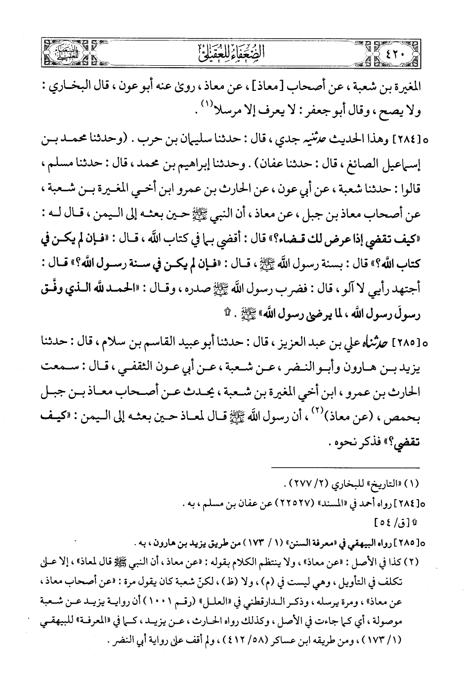 [284] (2) وهذا الحديث حدثنيه جدي، قال: حدثنا سليمان بن حرب. (وحدثنا محمد بن إسماعيل الصائغ، قال: حدثنا عفان). وحدثنا إبراهيم بن محمد، قال: حدثنا مسلم، قالوا: حدثنا شعبة، عن أبي عون، عن الحارث بن عمرو ابن أخي المغيرة بن شعبة، عن أصحاب معاذ بن جبل، عن معاذ، أن النبي صلى الله عليه وسلمع حين بعثه إلى اليمن، قال له: «كيف تقضي إذا عرض لك قضاء؟» قال: أقضي بما في كتاب الله، قال: «فإن لم يكن في كتاب الله؟» قال: بسنة رسول الله صلى الله عليه وسلمع، قال: «فإن لم يكن في سنة رسول الله؟» قال: أجتهد رأيي لا آلو، قال: فضرب رسول الله صلى الله عليه وسلمع صدره، وقال: «الحمد لله الذي وفَّق رسولَ رسول الله، لما يرضى رسول الله» صلى الله عليه وسلمع (3). ?