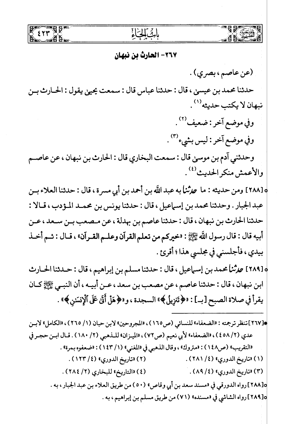 [288] (6) ومن حديثه: ما حدثنا به عبد الله بن أحمد بن أبي مسرة، قال: حدثنا العلاء بن عبد الجبار. وحدثنا محمد بن إسماعيل، قال: حدثنا يونس بن محمد المؤدب، قالا: حدثنا الحارث بن نبهان، قال: حدثنا عاصم بن بهدلة، عن مصعب بن سعد، عن أبيه قال: قال رسول الله صلى الله عليه وسلمع: «خيركم من تعلم القرآن وعلم القرآن»، قال: ثم أخذ بيدي، فأجلسني في مجلسي هذا؛ أقرئ.