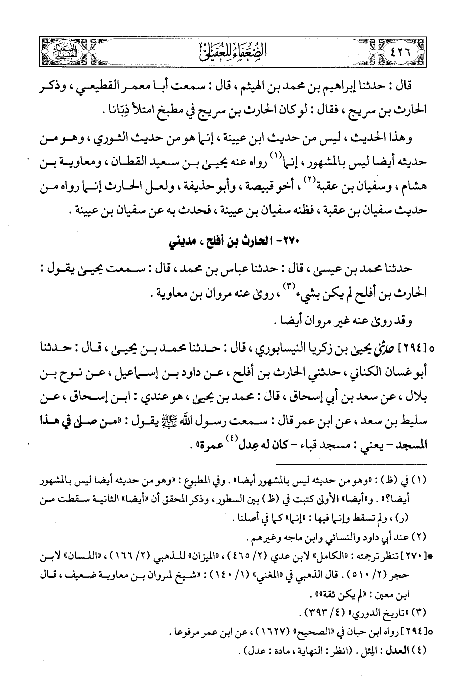 [294] (5) حدثني يحيى بن زكريا النيسابوري، قال: حدثنا محمد بن يحيى، قال: حدثنا أبو غسان الكناني، حدثني الحارث بن أفلح، عن داود بن إسماعيل، عن نوح بن بلال، عن سعد بن أبي إسحاق، قال: محمد بن يحيى، هو عندي: ابن إسحاق، عن سليط بن سعد، عن ابن عمر قال: سمعت رسول الله صلى الله عليه وسلمع يقول: «من صلى في هذا المسجد - يعني: مسجد قباء - كان له عِدل (6) عمرة».