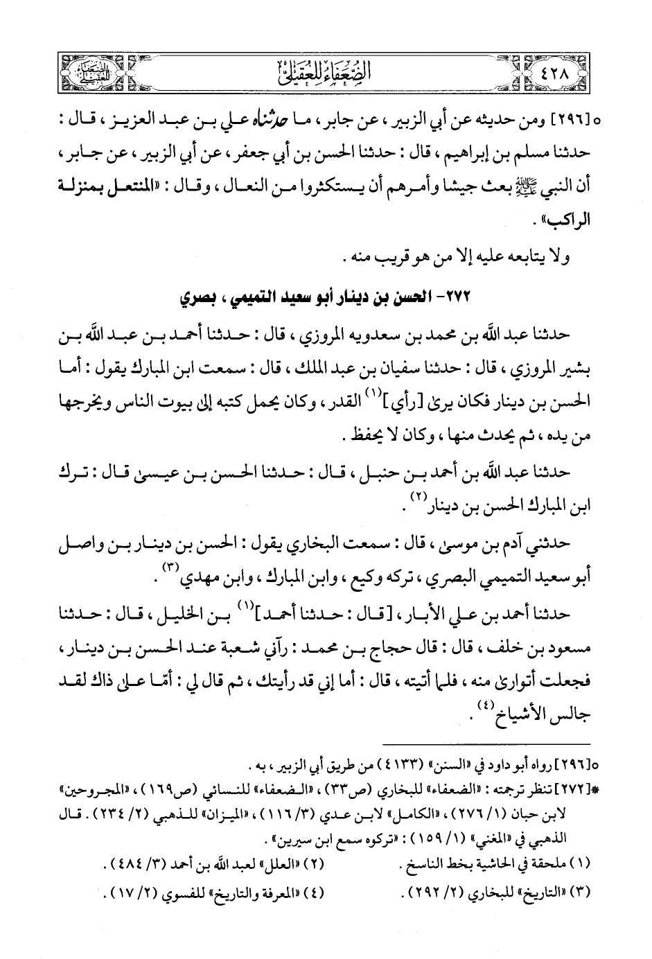 (2) * [272] تنظر ترجمته: «الضعفاء» للبخاري (ص33)، «الضعفاء» للنسائي (ص169)، «المجروحين» لابن حبان (1/ 276)، «الكامل» لابن عدي (3/ 116)، «الميزان» للذهبي (2/ 234). قال الذهبي في «المغني» (1/ 159): «تركوه سمع ابن سيرين».