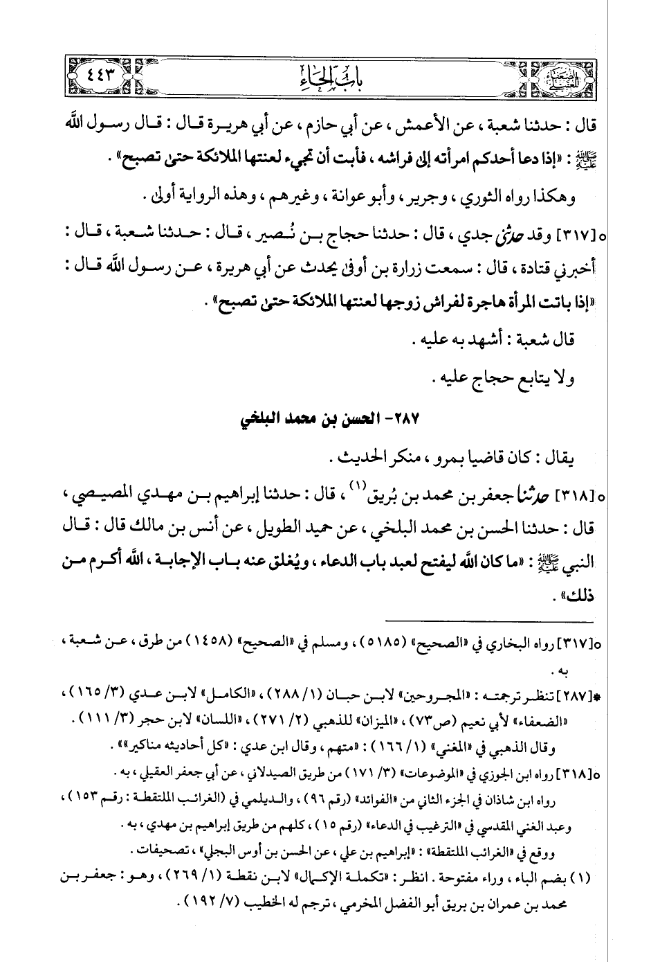 [317] (1) وقد حدثني جدي، قال: حدثنا حجاج بن نُصير، قال: حدثنا شعبة، قال: أخبرني قتادة، قال: سمعت زرارة بن أوفى يحدث عن أبي هريرة، عن رسول الله قال: «إذا باتت المرأة هاجرة لفراش زوجها لعنتها الملائكة حتى تصبح».