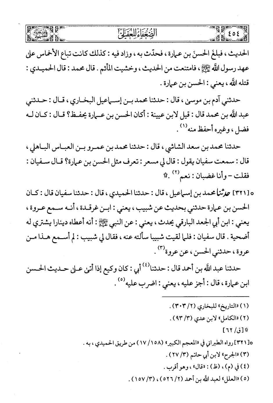 الحديث، فبلغَ الحسنَ بن عمارة، فحدّث به، وزاد فيه: كذلك كانت تباع الأخماس على عهد رسول الله صلى الله عليه وسلمع، فامتنعت من الحديث، وخشيت المأثم. قال محمد: قال الحميدي: قتله الله، يعني: الحسن بن عمارة.