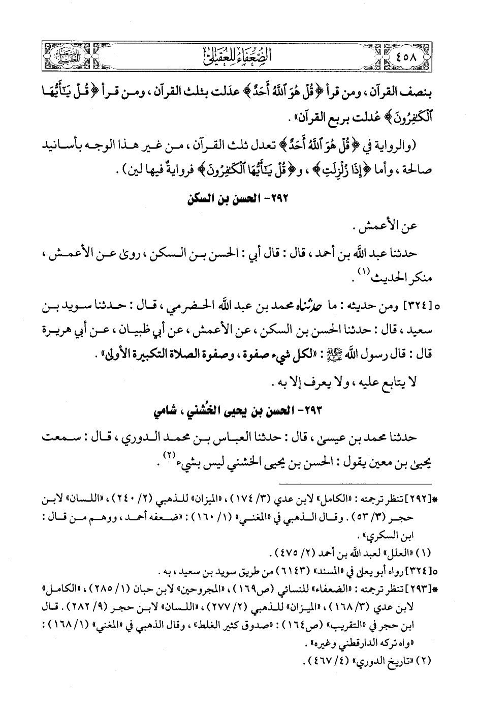 (1) * [292] تنظر ترجمته: «الكامل» لابن عدي (3/ 174)، «الميزان» للذهبي (2/ 240)، «اللسان» لابن حجر (3/ 53). وقال الذهبي في «المغني» (1/ 160): «ضعفه أحمد، ووهم من قال: ابن السكري».