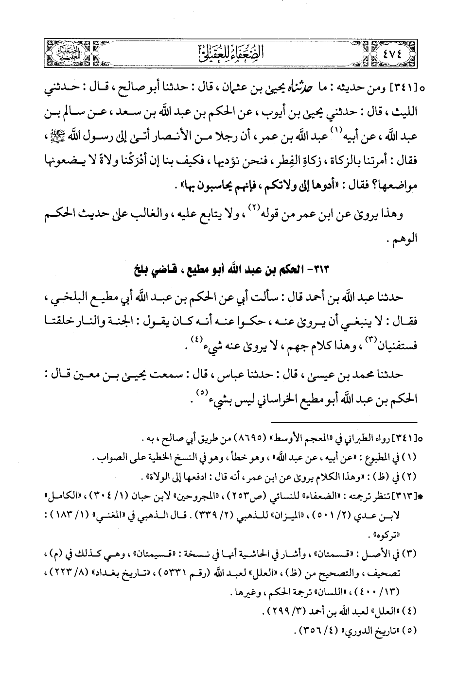 [341] (1) ومن حديثه: ما حدثناه يحيى بن عثمان، قال: حدثنا أبو صالح، قال: حدثني الليث، قال: حدثني يحيى بن أيوب، عن الحكم بن عبد الله بن سعد، عن سالم بن عبد الله، عن أبيه (2) عبد الله بن عمر، أن رجلا من الأنصار أتى إلى رسول الله صلى الله عليه وسلمع، فقال: أمرتنا بالزكاة، زكاةِ الفِطر، فنحن نؤديها، فكيف بنا إن أدْرَكْنا ولاةً لا يضعونها مواضعها؟ فقال: «أدوها إلى ولاتكم، فإنهم يحاسبون بها».