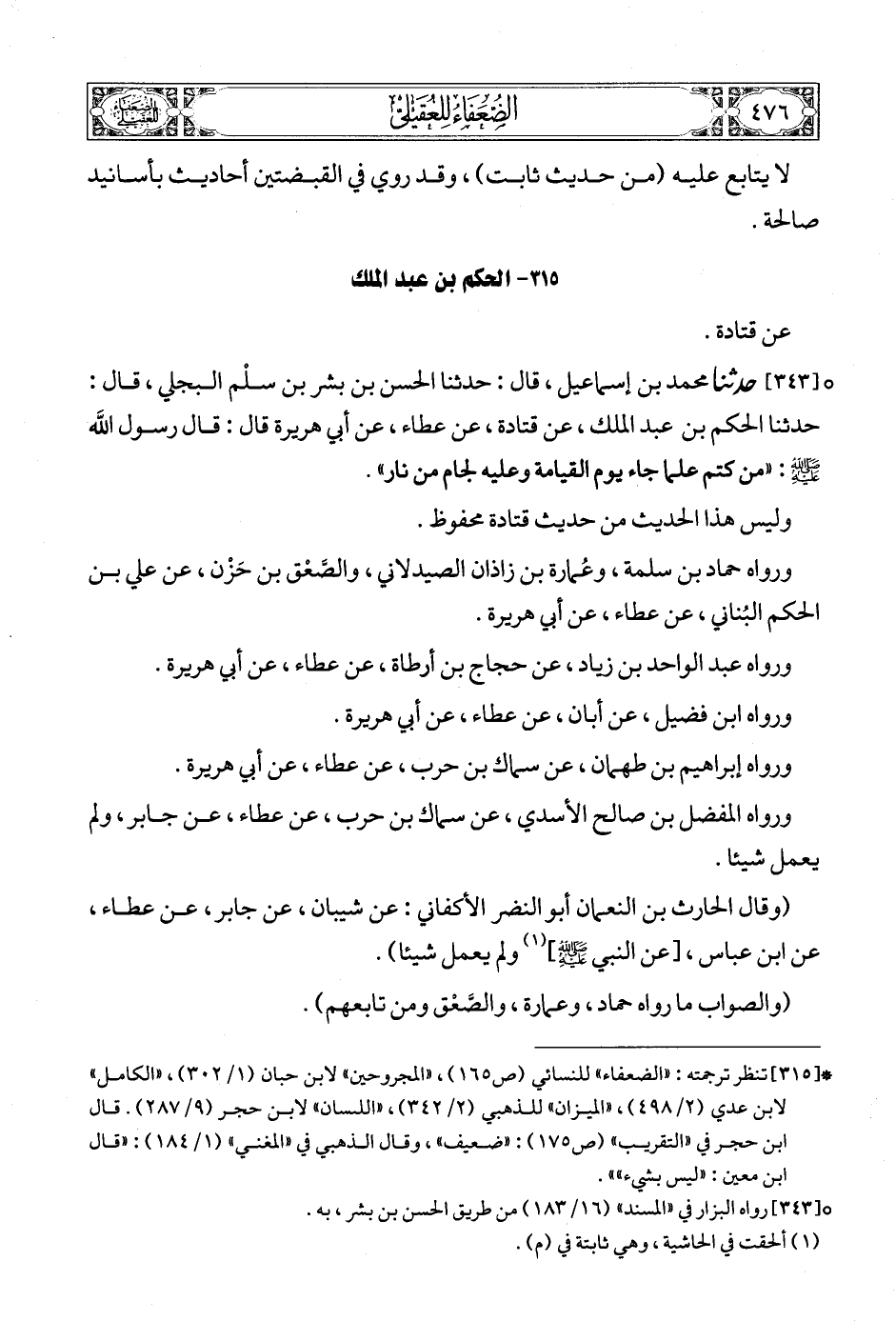 [343] (2) حدثنا محمد بن إسماعيل، قال: حدثنا الحسن بن بشر بن سلْم البجلي، قال: حدثنا الحكم بن عبد الملك، عن قتادة، عن عطاء، عن أبي هريرة قال: قال رسول الله صلى الله عليه وسلمع: «من كتم علما جاء يوم القيامة وعليه لجام من نار».