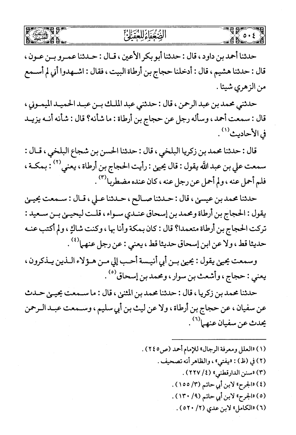 قال: حدثنا محمد بن زكريا البلخي، قال: حدثنا الحسن بن شجاع البلخي، قال: سمعت علي بن عبد الله يقول: قال يحيى: رأيت الحجاج بن أرطاة، يعني (2): بمكة، فلم أحمل عنه، ولم أحمل عن رجل عنه، كان عنده مضطربا (3).