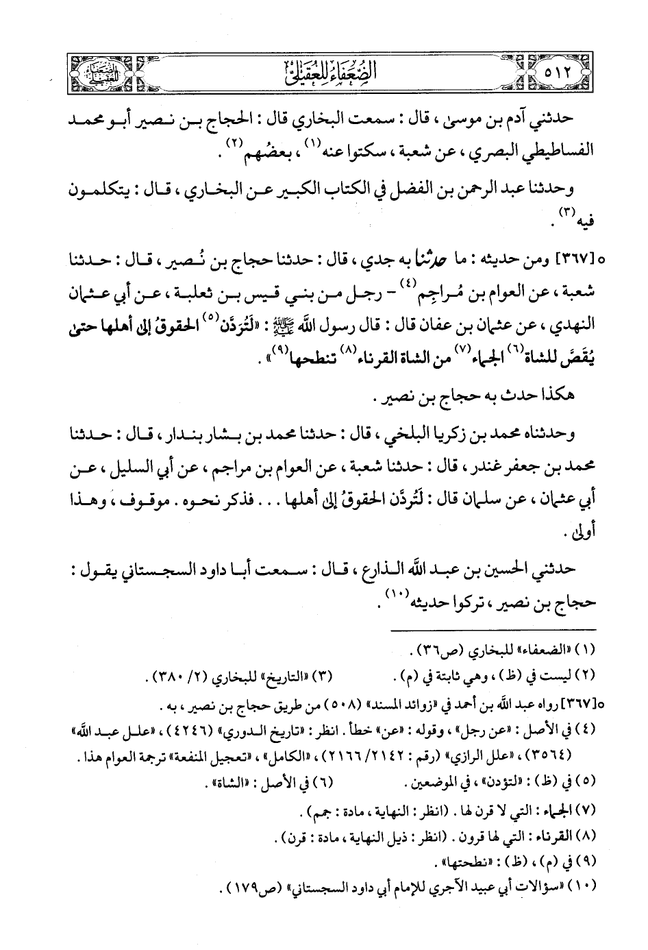 [367] (4) ومن حديثه: ما حدثنا به جدي، قال: حدثنا حجاج بن نُصير، قال: حدثنا شعبة، عن العوام بن مُراجِم (5) - رجل من بني قيس بن ثعلبة، عن أبي عثمان النهدي، عن عثمان بن عفان قال: قال رسول الله صلى الله عليه وسلمع: «لَتُرَدَّن (6) الحقوقُ إلى أهلها حتى يُقَصَّ للشاة (7) الجماء (8) من الشاة القرناء (9) تنطحها (10)».
