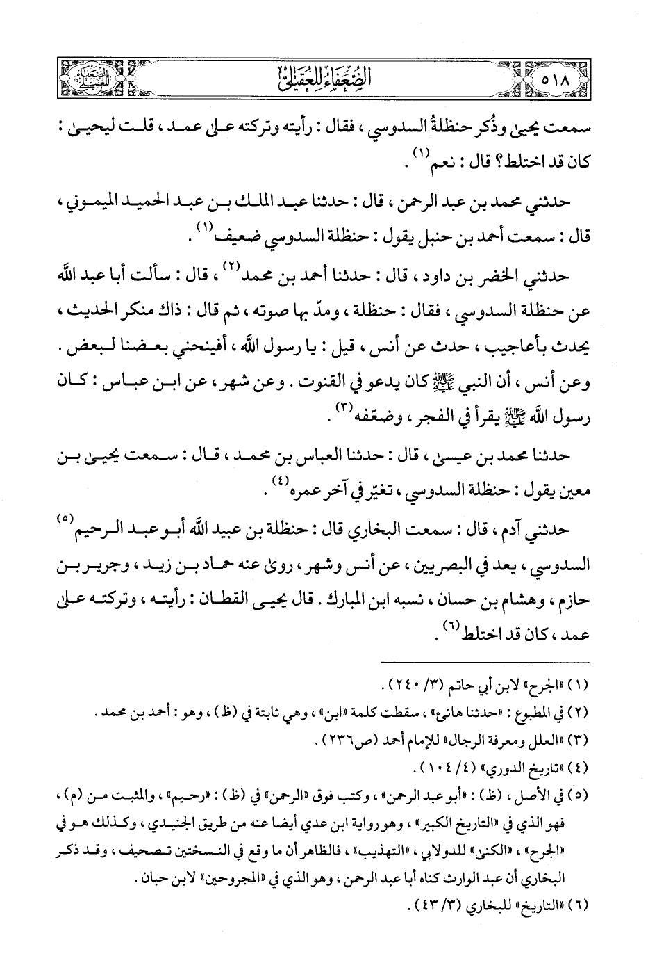 حدثني آدم، قال: سمعت البخاري قال: حنظلة بن عبيد الله أبو عبد الرحيم (5) السدوسي، يعد في البصريين، عن أنس وشهر، روى عنه حماد بن زيد، وجرير بن حازم، وهشام بن حسان، نسبه ابن المبارك. قال يحيى القطان: رأيته، وتركته على عمد، كان قد اختلط (6).