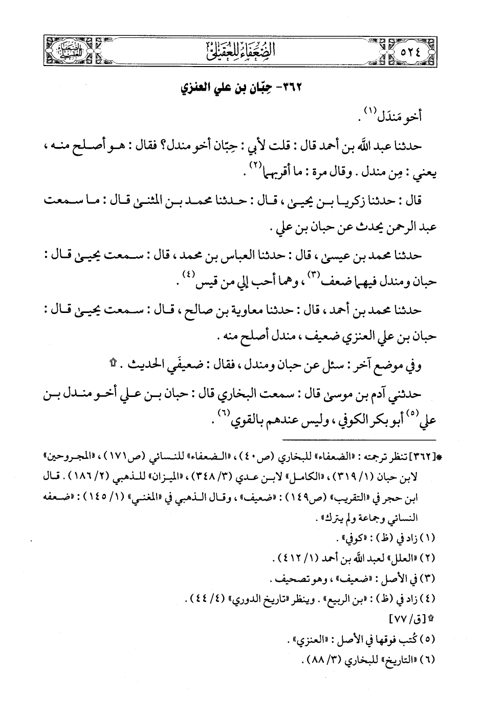 (1) * [362] تنظر ترجمته: «الضعفاء» للبخاري (ص40)، «الضعفاء» للنسائي (ص171)، «المجروحين» لابن حبان (1/ 319)، «الكامل» لابن عدي (3/ 348)، «الميزان» للذهبي (2/ 186). قال ابن حجر في «التقريب» (ص149): «ضعيف»، وقال الذهبي في «المغني» (1/ 145): «ضعفه النسائي وجماعة ولم يترك».