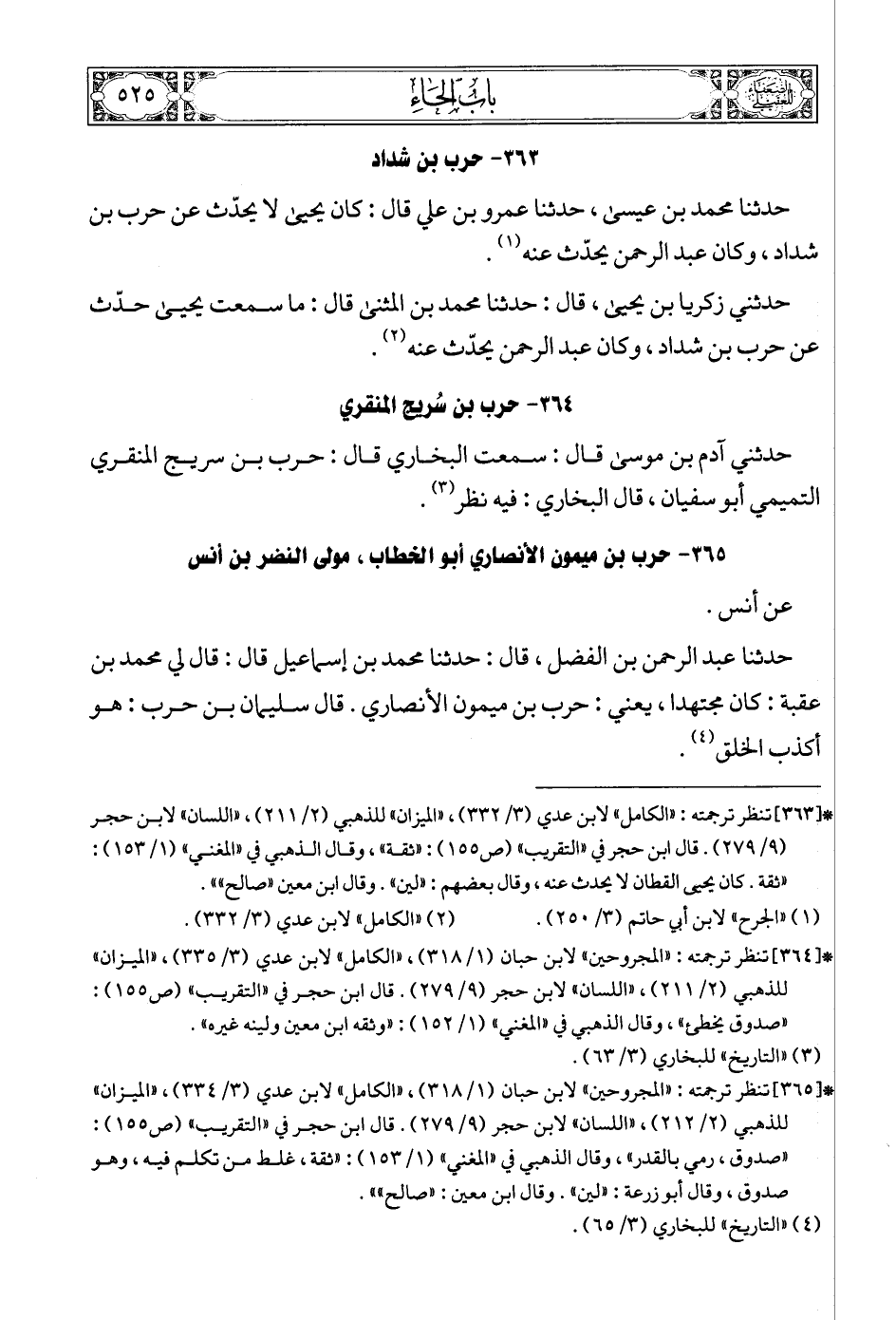 (4) * [364] تنظر ترجمته: «المجروحين» لابن حبان (1/ 318)، «الكامل» لابن عدي (3/ 335)، «الميزان» للذهبي (2/ 211)، «اللسان» لابن حجر (9/ 279). قال ابن حجر في «التقريب» (ص155): «صدوق يخطئ»، وقال الذهبي في «المغني» (1/ 152): «وثقه ابن معين ولينه غيره».
