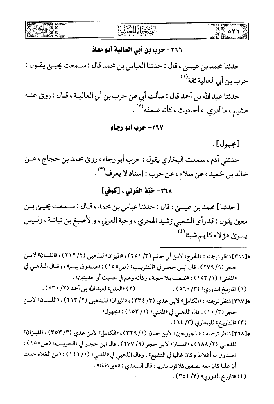 (4) * [367] تنظر ترجمته: «الكامل» لابن عدي (3/ 334)، «الميزان» للذهبي (2/ 213)، «اللسان» لابن حجر (3/ 10). قال الذهبي في «المغني» (1/ 153): «مجهول».