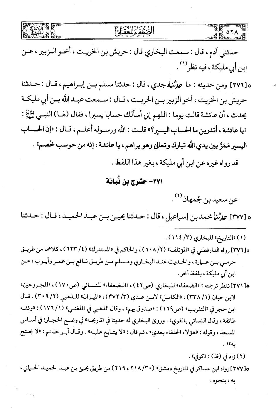 (2) [376] رواه الدارقطني في «المؤتلف» (2/ 608)، والحاكم في «المستدرك» (4/ 623)، كلاهما من طريق حرمي بن عمارة، والحديث عند البخاري ومسلم من طريق نافع بن عمر وأيوب، عن ابن أبي مليكة، بلفظ آخر.