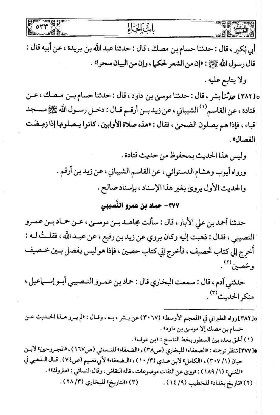 أبي بُكير، قال: حدثنا حسام بن مصك، قال: حدثنا عبد الله بن بريدة، عن أبيه قال: قال رسول الله صلى الله عليه وسلمع: «إن من الشعر لحكما، وإن من البيان سحرا».