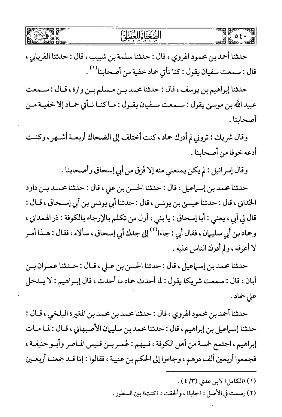 حدثنا إبراهيم بن يوسف، قال: حدثنا محمد بن مسلم بن وارة، قال: سمعت عبيد الله بن موسى يقول: سمعت سفيان يقول: ما كنا نأتي حماد إلا خفية من أصحابنا.