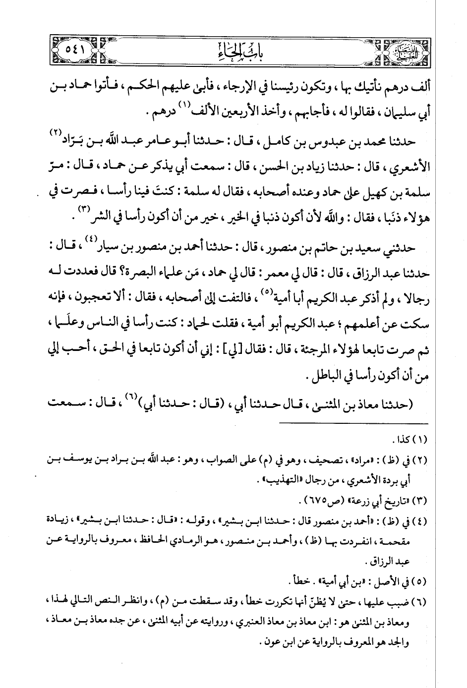 حدثني سعيد بن حاتم بن منصور، قال: حدثنا أحمد بن منصور بن سيار (4)، قال: حدثنا عبد الرزاق، قال: قال لي معمر: قال لي حماد، مَن علماء البصرة؟ قال فعددت له رجالا، ولم أذكر عبد الكريم أبا أمية (5)، فالتفت إلى أصحابه، فقال: ألا تعجبون، فإنه سكت عن أعلمهم؛ عبد الكريم أبو أمية، فقلت لحماد: كنت رأسا في الناس وعلَما، ثم صرت تابعا لهؤلاء المرجئة، قال: فقال [لي]: إني أن أكون تابعا في الحق، أحب إلي من أن أكون رأسا في الباطل.