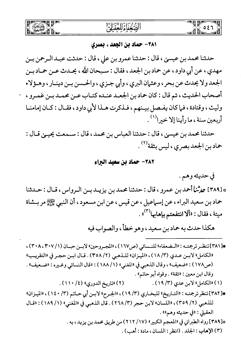 (4) * [382] تنظر ترجمته: «التاريخ» للبخاري (3/ 19)، «الجرح» لابن أبي حاتم (3/ 140)، «الميزان» للذهبي (2/ 359)، «اللسان» لابن حجر (3/ 268). قال الذهبي في «المغني» (1/ 189): «قال العقيلي: «في حديثه وهم»».