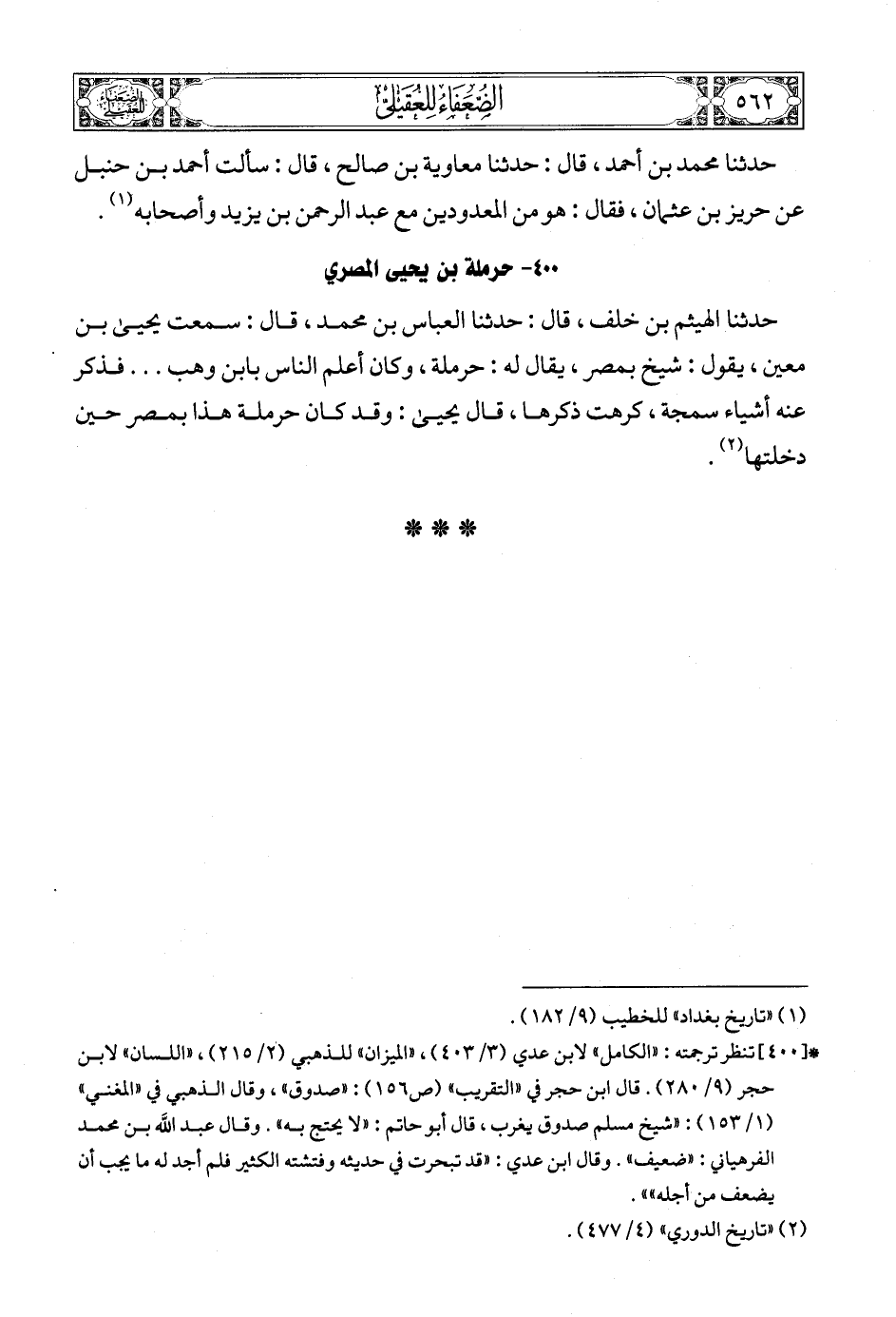 (2) * [400] تنظر ترجمته: «الكامل» لابن عدي (3/ 403)، «الميزان» للذهبي (2/ 215)، «اللسان» لابن حجر (9/ 280). قال ابن حجر في «التقريب» (ص156): «صدوق»، وقال الذهبي في «المغني» (1/ 153): «شيخ مسلم صدوق يغرب، قال أبو حاتم: «لا يحتج به». وقال عبد الله بن محمد الفرهياني: «ضعيف». وقال ابن عدي: «قد تبحرت في حديثه وفتشته الكثير فلم أجد له ما يجب أن يضعف من أجله»».